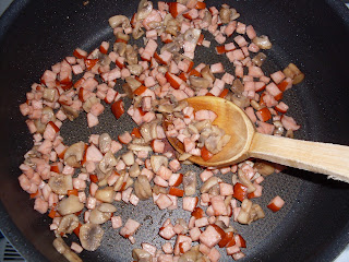 Ciupercile se taie felii mici si se pun la calit cu pastrama de porc, in foarte putin ulei.